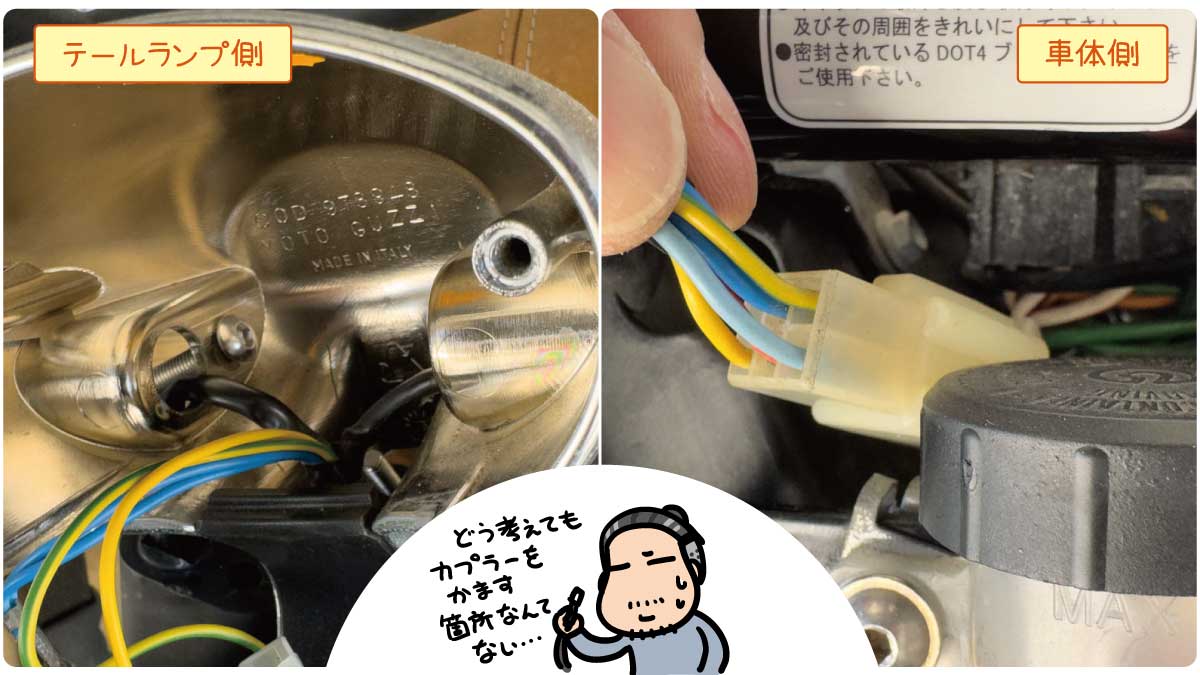 うちのMOTO GUZZI V7 STONE(以降V7)のリヤウインカーがどちらも折れちゃったので、純正パーツを買ってきて新品に交換しちゃうんだー…と作業してみた続きです。純正ウインカーパーツにカプラーが付いてたので、それをはめ込むだけだ...